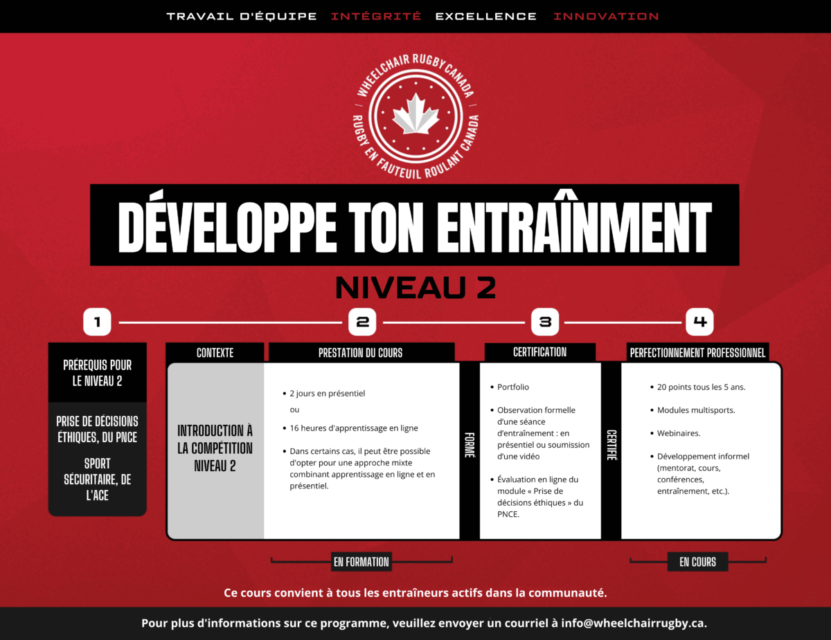 Pour s’assurer que chaque entraîneur de rugby en fauteuil roulant possède les compétences nécessaires pour réussir, l’Association canadienne des entraîneurs et Rugby en fauteuil roulant Canada ont travaillé ensemble pour élaborer un modèle de développement des entraîneurs du Programme national de certification des entraîneurs (PNCE) pour aider les entraîneurs à développer leurs compétences.