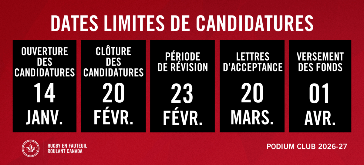 Le programme Podium Club de Rugby en fauteuil roulant Canada est un programme qui offre un large éventail de subventions visant à favoriser la croissance et la durabilité du rugby en fauteuil roulant à travers le Canada au niveau de la communauté et de la base. Le programme vise principalement à aider au développement des clubs de rugby en fauteuil roulant, bien qu’il y ait des fonds disponibles pour les organisations sportives provinciales si leur demande profite à leur système de clubs.
